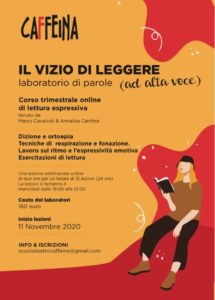 Non solo: Teatro Caffeina è anche scoperta delle tecniche podcast, lavoro sull’espressività contemporanea e riflessione sulle tecnologie a tutto tondo. Arriva “Il vizio di leggere (ad alta voce)”, laboratorio di lettura espressiva in formula online che è pronto a proporre ai tanti appassionati la possibilità di esercitarsi in una tecnica sempre più popolare: oggi l’ascolto viene tenuto infatti in una crescente considerazione. Le letture alla radio, gli audiolibri, le letture pubbliche, reading, letture per bambini stanno vivendo un momento di attenzione e riscoperta.