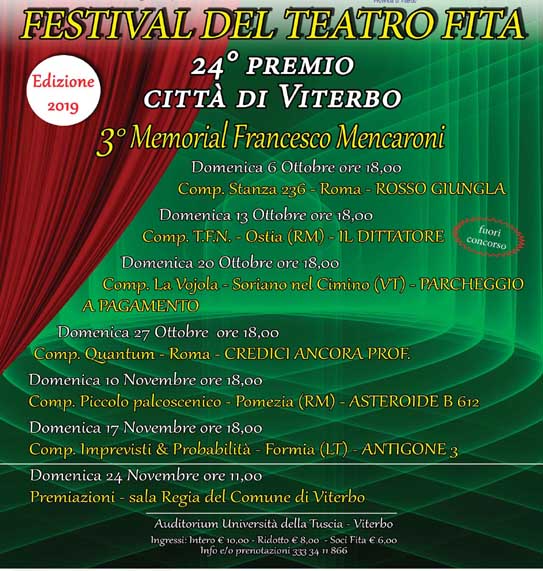 Festival Teatro amatoriale FITA XXXIV Premio Città di Viterbo, III Memorial Francesco Mencaroni, il terzo appuntamento sarà con Parcheggio a pagamento, domenica 20 ottobre alle 18, all’interno dell’Auditorium dell’Università degli Studi della Tuscia (Santa Maria in Gradi, ingresso via Sabotino). “Non preoccupiamoci – scherza sul titolo dello spettacolo Bruno Mencarelli, presidente provinciale Fita -. Gli spettatori potranno parcheggiare liberamente. Parcheggio a pagamento è il titolo della commedia di Italo Conti, autore più rappresentato dalle compagnie italiane del teatro amatoriale. La compagnia di Soriano nel Cimino La Vojola, invitata dagli organizzatori del festival, la interpreteranno per il nostro pubblico. Uno spaccato di vita in una clinica scassata dove viene sottolineato il gravissimo annoso problema dell’abbandono. La storia racconta la visita improvvisa e tutt’altro che disinteressata di alcuni parenti a un povero vecchietto ricoverato. Scopo della visita è quello di farsi firmare incartamenti per la riscossione di una ingente somma di denaro. Una commedia voluta con l’intento della valorizzazione e della conservazione delle lingue locali: la rappresentazione sarà infatti in dialetto sorianese, una brillante e caratteristica lingua che già, con la sua particolare inflessione, farà sorridere e divertire. Colpi di scena, sotterfugi, verità nascoste e falsità, faranno da corollario, e anche da fulcro, nello svolgersi dei fatti: una cruda e cinica situazione intrisa di espedienti per portare a termine le finalità degli amorevoli parenti”.