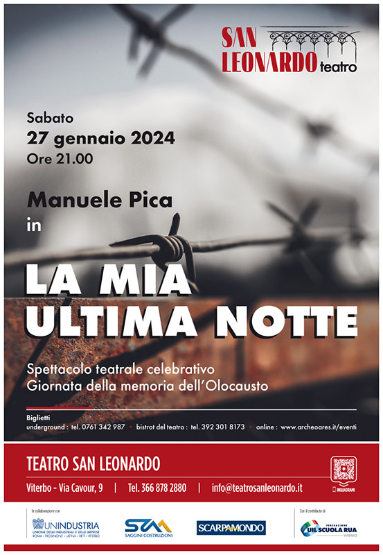 Il Teatro San Leonardo partecipa attivamente alla Giornata della Memoria, ricorrenza internazionale atta a commemorare le vittime dell’Olocausto e invita tutti i cittadini a partecipare allo spettacolo e reading teatrale celebrativo “La mia ultima notte” di e con Manuele Pica, adattamento del testo “La Notte” di Eliezer Wiesel; scene e costumi Sartoria Due.