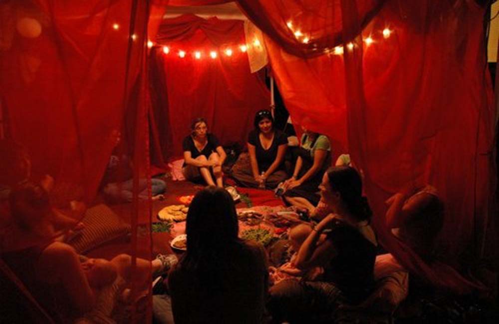 La Tenda Rossa era usata dai popoli nomadi quando la carovana sostava per lungo tempo in un luogo. Essa rappresentava il posto sacro riservato rigorosamente solo alle donne poiché qui vi si svolgevano tutte le attività femminili più importanti, dal parto alla malattia, dalla prima mestruazione alla menopausa.