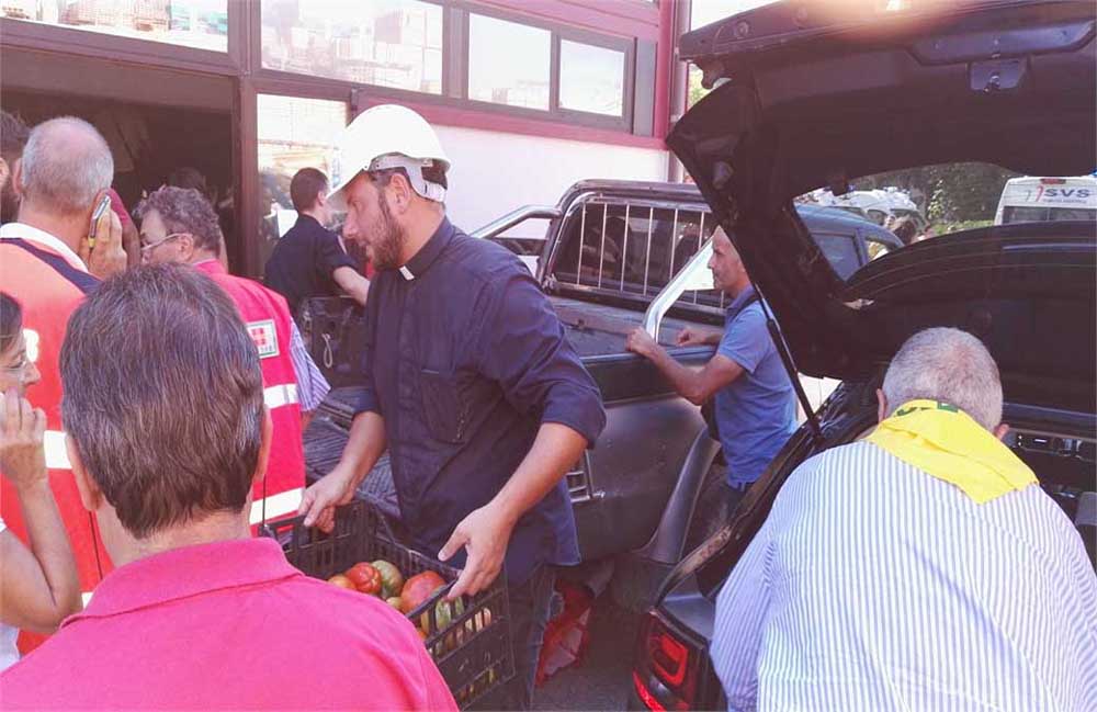 Intorno alle 14 di mercoledì sono stati scaricati i primi aiuti alimentari raccolti a Rieti: due auto cariche di polli, fettine di carne, hamburger sottovuoto, pesche, pomodori, mele, pane, pizza, biscotti. I beni sono stati presi in consegna dagli uomini della Protezione Civile e da don Fabio, parroco di un paesino del circondario che partecipa, da volontario, alle operazioni di soccorso.
