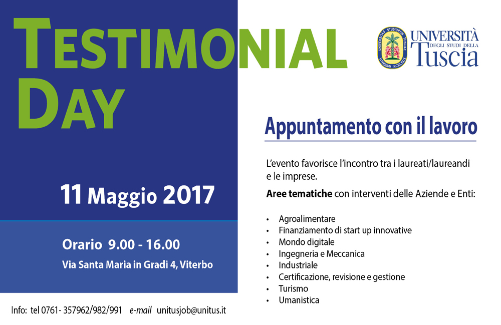 Giovedì 11 maggio dalle ore 9.00 alle ore 16.00 presso l’Università degli Studi della Tuscia a Santa Maria in Gradi si terrà il Testimonial Day, l’appuntamento con il mondo del lavoro.Un incontro che favorisce tra l’incontro laureati/laureandi e le imprese.Queste le aree tematiche che saranno trattate con interventi autorevoli di Aziende e di Enti:
