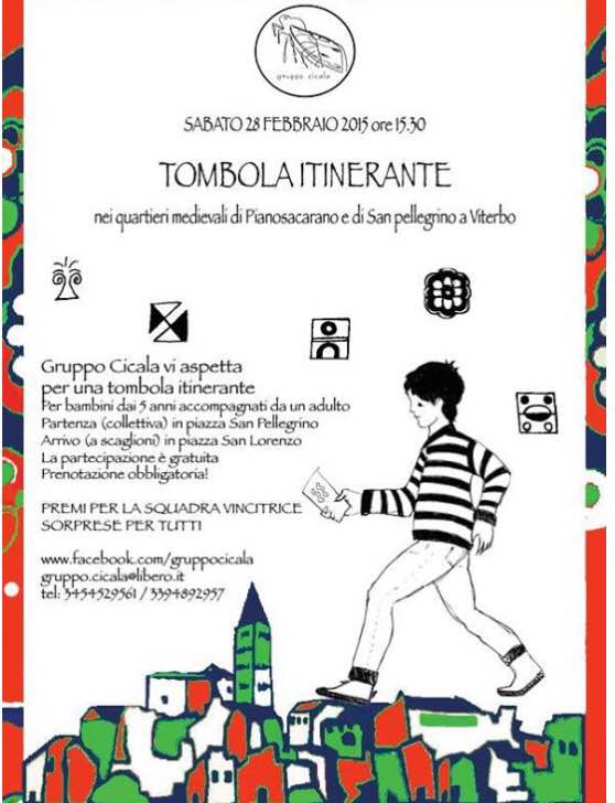 Tombola itinerante per i bambini nel cuore medioevale di VIterbo. A organizzarla Il Gruppo Cicala con la partecipazione dei negozianti dei quartieri medievali di Pianoscarano e di San Pellegrino a Viterbo, sabato 28 febbraio dalle ore 15:30 alle 17:00 circa.  Sono invitati tutti i bambini dai 5 anni accompagnati dai genitori; la partecipazione e’ gratuita ma per fini organizzativi è obbligatoria la prenotazione. La divertente iniziativa ha come obiettivo, oltre a far trascorrere una divertente giornata per grandi e piccoli, quello di far vivere a tutti i partecipanti le bellezze della città di Viterbo, tra le sue vie, i negozi e gli abitanti.