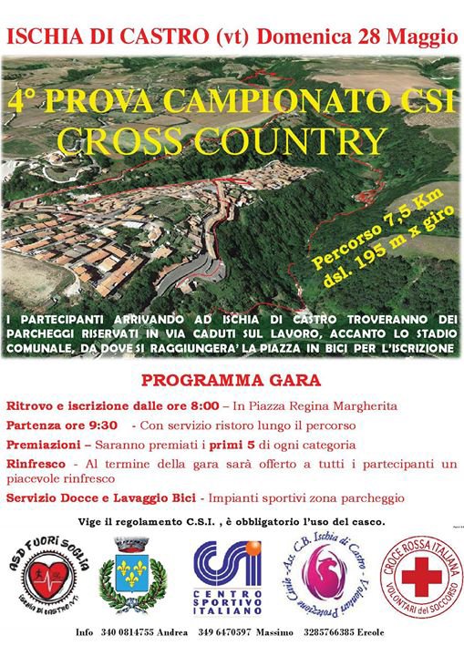 Domenica 28 maggio si rinnova a Ischia Di Castro l’appuntamento con una delle prove del campionato provinciale CSI di Cross Country per MTB. La competizione, organizzata dal Centro Sportivo italiano e dall’ASD Fuori Soglia con il patrocinio del Comune di Ischia di Castro, è aperta a tutti gli atleti tesserati con i vari comitati sportivi.