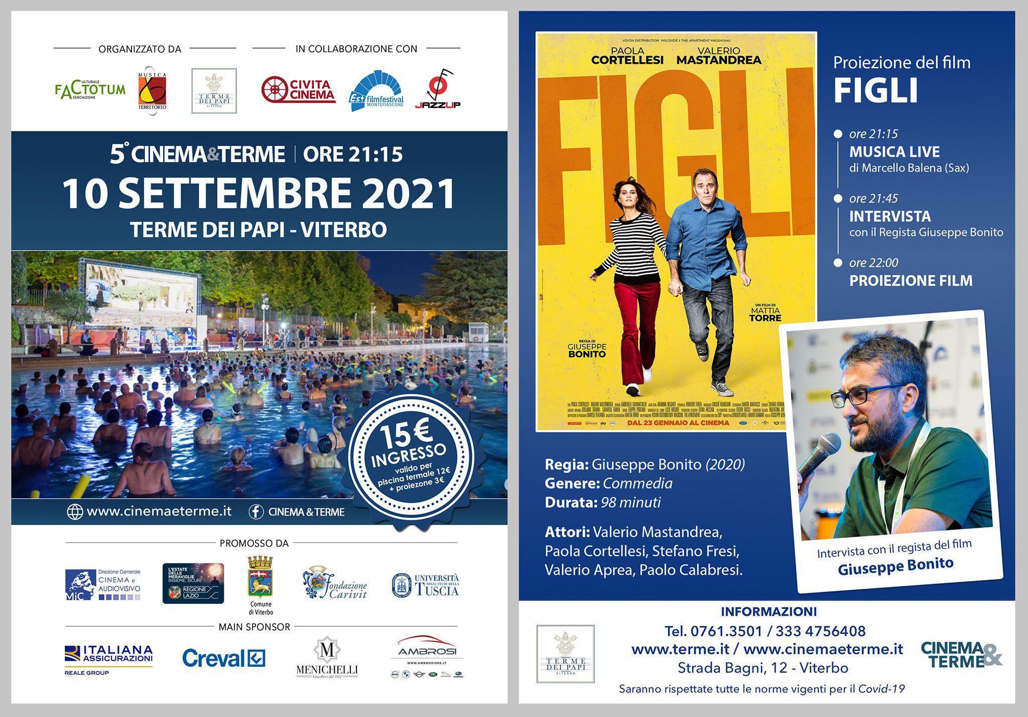 L’evento non ha mutato la sua formula: si potrà accedere alla piscina termale già dalle ore 20.45, per poi godersi dalle ore 21.15 il momento di musica live con il magico Sax del Maestro Marcello Balena e dalle ore 21.45 l’incontro con il regista del film e alle 22.00 la proiezione del film. Cinema e Terme è un evento davvero esclusivo, in grado di unire cultura e benessere fisico in un momento in cui forse nulla è diventato più importante. Lo spettatore potrà godere di tutta questa offerta comodamente adagiato all’interno delle calde acque termali pagando un biglietto unico di soli 15 € per gli adulti e 11 € per i bambini dai 2 ai 12 anni.