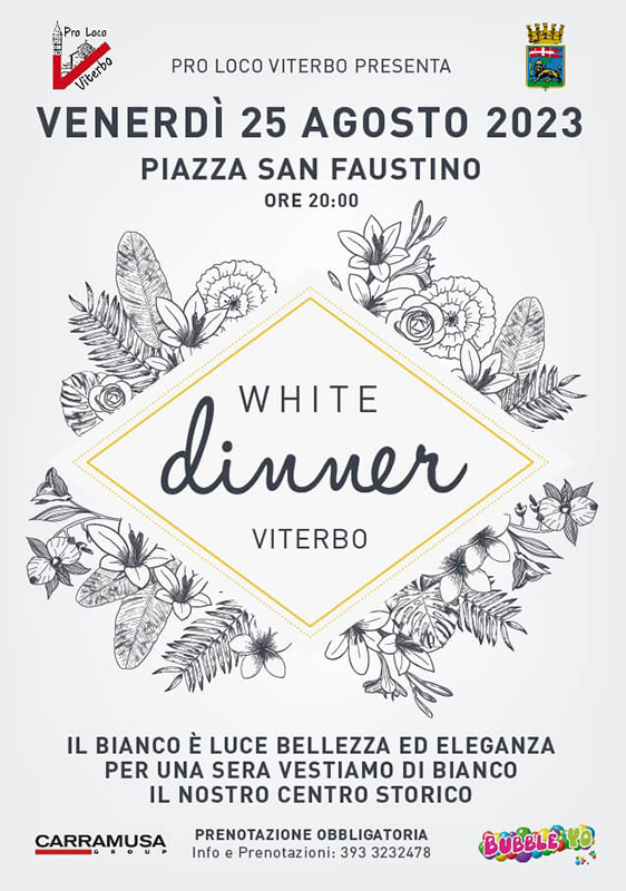 Venerdi 25 agosto, nella piazza principale del quartiere di San Faustino a Viterbo si rinnova l’evento White dinner, organizzato dalla Pro loco con l’attivissima presidente Irene Temperini. L’appuntamento è stato presentato a Palazzo dei Priori questo mercoledi mattina alla presenza della sindaca Chiara Frontini, del vice sindaco Alfonso Antoniozzi, assessore alla Cultura e all’Educazione ,della artefice della rassegna Irene Temperini, e del suo braccio destro la bravissima Vera Anelli, immancabile la presenza di Don Flavio Valeri, parroco Sacro Cuore e San Faustino che nell’occasione ha annunciato che  terrà aperta la bellissima chiesa in cui si osserveranno due celebrazioni: la reincoronazione della Madonna di Costantinopoli la cui effige si trova all’interno della chiesa. A seguiresi commemoreranno  i 500 anni dell’arrivo dei Cavalieri di Malta a Viterbo che avevano nella chiesa di San Faustino il loro punto di riferimento che fu la loro prima sede italiana..