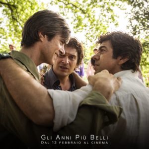 “Gli anni più belli” è lLa storia di quattro amici, Giulio (Pierfrancesco Favino), Gemma (Micaela Ramazzotti), Paolo, (Kim Rossi Stuart), Riccardo (Claudio Santamaria), raccontata nell’arco di quarant’anni, dal 1980 ad oggi, dall’adolescenza all’età adulta. Le loro speranze, le loro delusioni, i loro successi e fallimenti sono l’intreccio di una grande storia di amicizia e amore attraverso cui si raccontano anche l’Italia e gli italiani. Un grande affresco che racconta chi siamo, da dove veniamo e anche dove andranno e chi saranno i nostri figli. È il grande cerchio della vita che si ripete con le stesse dinamiche, nonostante sullo sfondo scorrano anni e anche epoche differenti. Gli anni più belli è il dodicesimo film di Gabriele Muccino,è “lo srotolamento del racconto generazionale, l’epos di un’amicizia tra tre ragazzi e una ragazza che attraversa 40 anni di storia italiana e mondiale –un periodo storico che non ha più nulla di così tremendamente politico, ma anche di vagamente idealistico da raccontare.