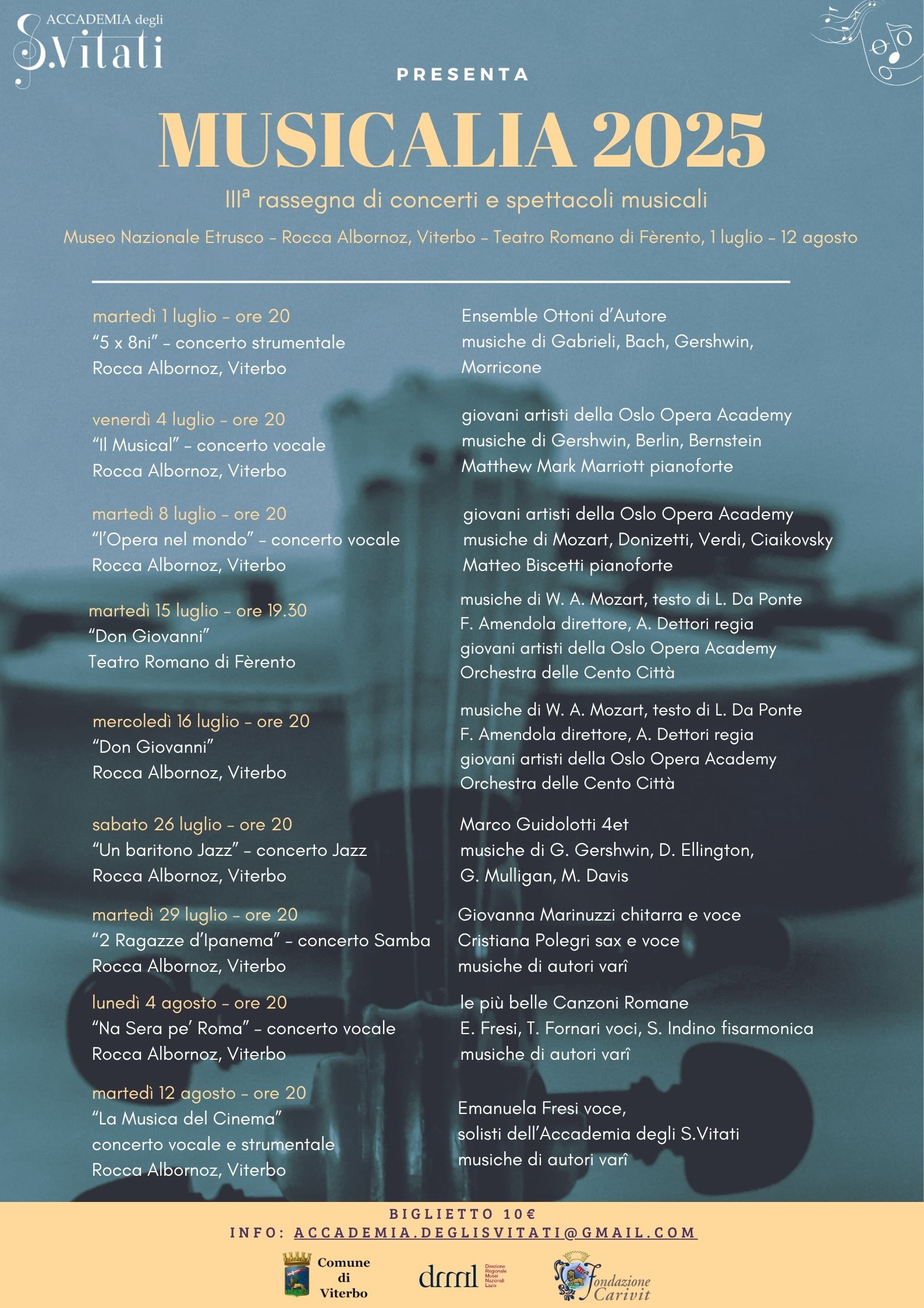 Torna per il terzo anno consecutivo, particolarmente attesa nel suggestivo cortile interno del Museo Nazionale Etrusco di Rocca Albornoz, la terza rassegna “Musicalia” organizzata dalla Accademia degli S.Vitati e presieduta dal maestro Federico Amendola, in collaborazione con la Direzione Regionale Musei Nazionali Lazio, il Comune di Viterbo e la Fondazione Carivit, in continuità con il ricco calendario di eventi musicali invernali.