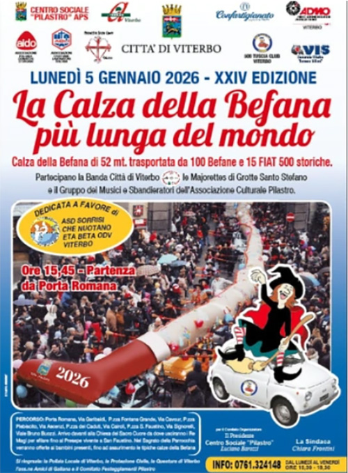 La calza è lunga 52 metri sarà trasportata da circa cento Befane e 15 Fiat 500 storiche. Insieme alla calza sfileranno la Banda Città di Viterbo Musichiamo, le Majorette di Grotte Santo Stefano e il gruppo dei Musici e Sbandieratori dell’associazione culturale Pilastro.