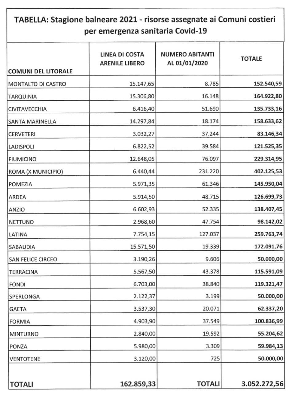 La somma verrà ripartita tra 21 Comuni costieri e 2 Comuni delle isole pontine, in funzione di due parametri: la popolazione e la lunghezza di arenile libero – ossia delle spiagge libere e libere con servizi – del loro territorio. Le somme spettanti a ciascun ente locale, almeno 50.000 euro, sono riportate nella tabella allegata.