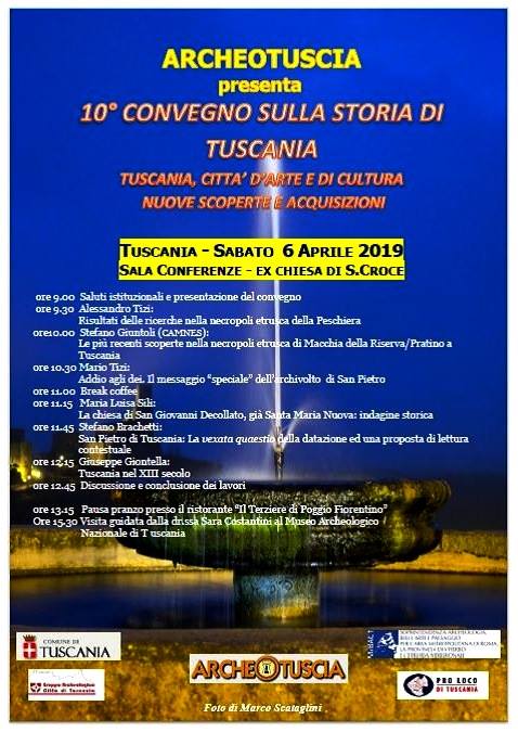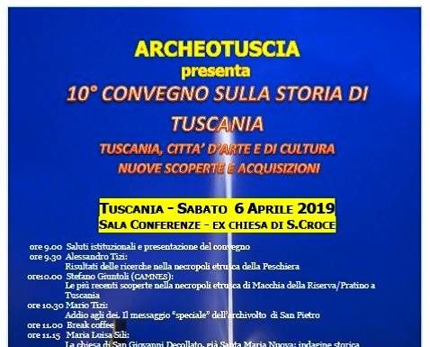 Tuscania città d’arte e di cultura. Nuove scoperte e acquisizioni” è il tema conduttore del decimo convegno sulla storia di Tuscania, organizzato da Archeotuscia onlus di Viterbo e la partecipazione del comune di Tuscania; la Soprintendenza archeologia, belle arti e paesaggio per l’area metropolitana di Roma, la provincia di Viterbo e l’Etruria meridionale; il gruppo archeologico “Città di Tuscania” e la proloco di Tuscania. L’appuntamento è per sabato 6 aprile (inizio alle 9) presso la sala conferenze – ex chiesa S. Croce.
