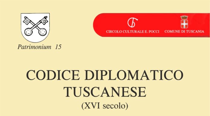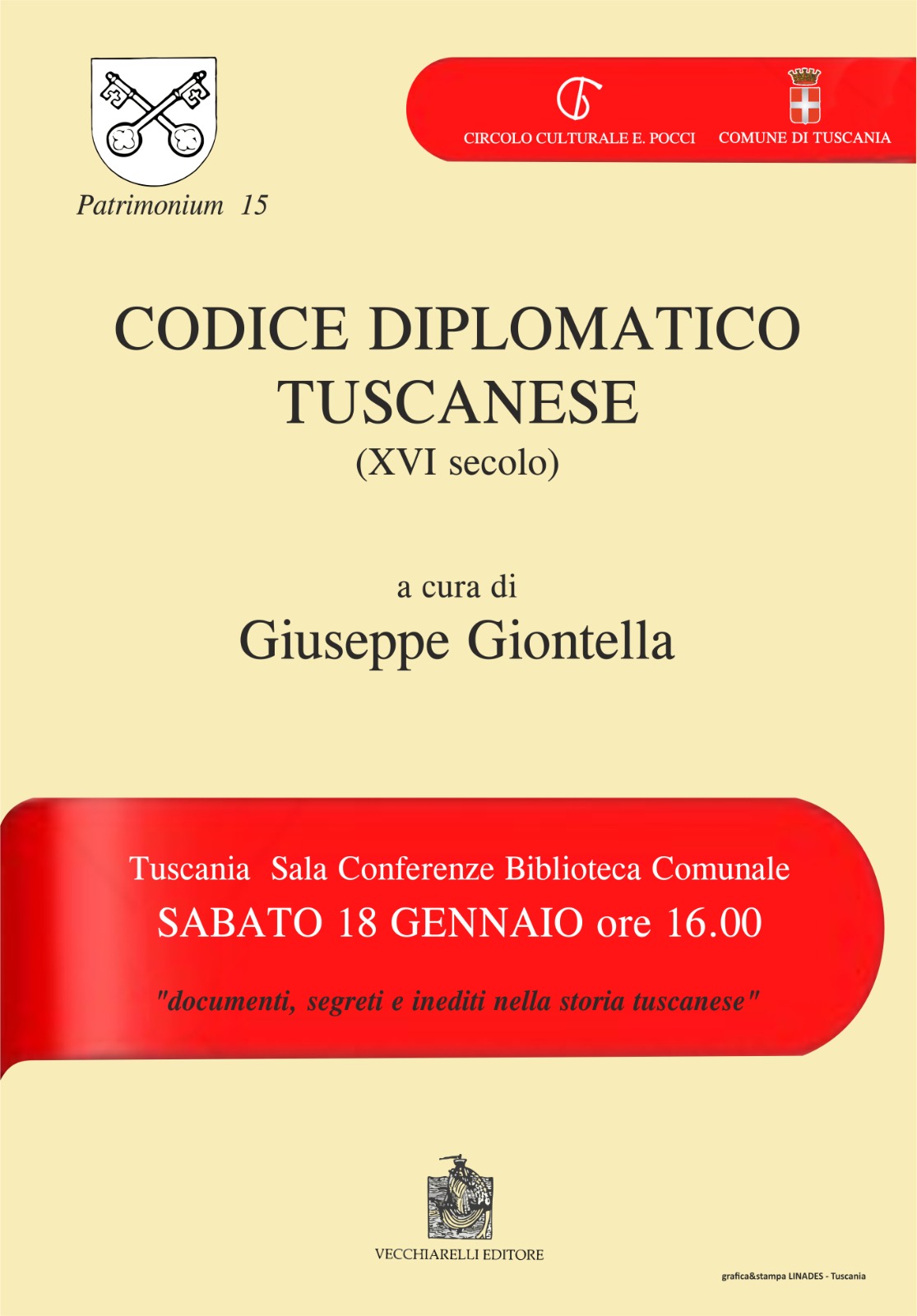 Sabato 18 gennaio alle ore 16 presso la sala conferenze della Biblioteca Comunale (ex chiesa di Santa Croce) in piazza Basile, il Circolo Culturale Enrico Pocci con il patrocinio del Comune di Tuscania, ha il piacere di presentare un’opera straordinaria dello storico Giuseppe Giontella: la recente pubblicazione dei documenti rilevati negli archivi storici di Tuscania (Archivio Capitolare della  chiesa Concattedrale di S. Giacomo e Archivio comunale) insieme a molti documenti provenienti da altri archivi.