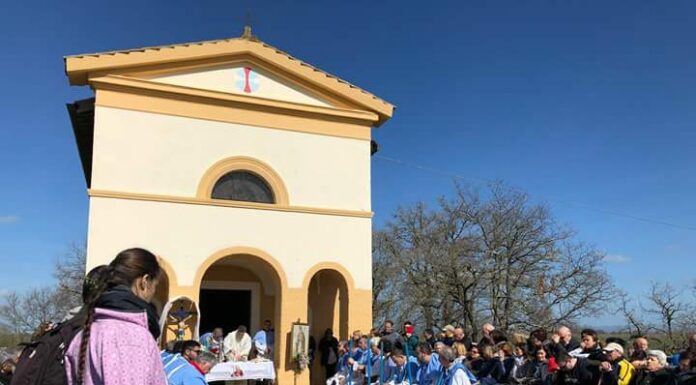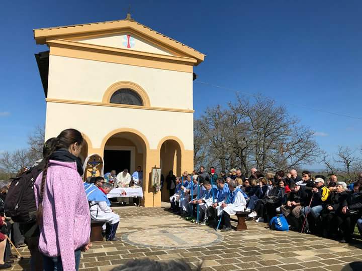 I partecipanti vengono accolti in paese dal parroco, per la benedizione, dalle autorità cittadine e dalla banda musicale “Mario Alberti” che li precedono fino alla chiesa dell’Assunta, dove i fedeli vengono ammessi al rito del “bacio” di un’immagine del santo, mentre viene intonato l’inno al patrono. Riportiamo la prima strofa e il ritornello: