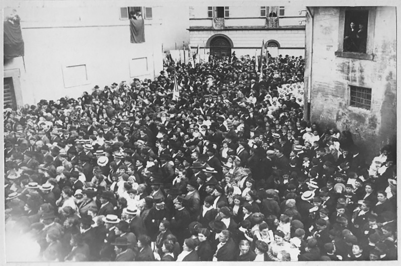 Nella foto, piazza Santa Maria Nuova a Viterbo durante il discorso di un domenicano dal pulpito di San Tommaso (1913).