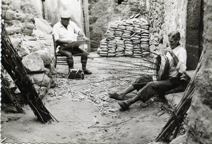 Occorrono le fruste giuste che si trovano nelle boscaglie o presso i corsi d’acqua. E soprattutto è richiesta una tecnica manuale che si apprende solo sul campo. Tra i “canestrari” mi viene in mente “Patacchino” alias Luigi Cutigni che abitava a Viterbo in contrada Ponte di Cetti. Era un’attrazione turistica. Si fermavano da lui per vederlo lavorare ed acquistare. C’era poi Zefferino che operava invece nel quartiere di Pianoscarano, sempre a Viterbo in via delle Caprarecce. Mi accorsi tardi di averne anche uno in famiglia, mio cognato, Ovidio Cima che nel capanno campestre presso Bagnaia, con vista Cimini, aveva attrezzato un piccolo laboratorio dotato degli attrezzi più incredibili alcuni creati con le sue mani. Mi confezionò un canestro, che ancora conservo, per i prodotti dell’orto, ed uno più piccolo per le fragole. Sempre a Bagnaia si faceva apprezzare anche Guido della Gasperina che addirittura lavorava su ordinazione, tanto erano le richieste. E nelle fiere di paese ce n’era sempre uno, che attirava attenzione e curiosità. La catena di montaggio è semplice. Si parte dalle fruste che si ottengono da vari ramoscelli di piante. Buoni il salice con rami lunghi e flessibili (che viene usato anche per le legature) e il nocciolo purché selvatico. L’olivo va bene per la resistenza. Abbastanza comune l’olmo, peraltro facile a procurarsi, i cui rami vanno però mondati dai getti non fruttiferi. Il giunco si trova a bordo dei ruscelli. E’ adatta la canna, purché dura, che va recisa con la luna calante. In genere le forme dei canestri sono circolari, a tronco di cono rovesciato, con o senza manico. Assumono i nomi più curiosi riferiti al loro impiego: capagno, capagnolo capagnone. Ideali per raccogliere funghi, nocciole, olive, castagne, e frutta, comprese le more selvatiche. Fra i più diffusi, il paniere sempre a disposizione in cucina, magari sulla madia. Al mercato di piazza del Gesù a Viterbo venivano utilizzate vere e proprie lettighe incannucciate per esporre le verdure gocciolanti, costantemente innaffiate per mantenerle sempre vive e fresche. L’acqua scollava in terra tra le maglie dell’intreccio. Il “fuscellone” a due manici veniva invece usato per contenere la legna presso la stufa o il camino.