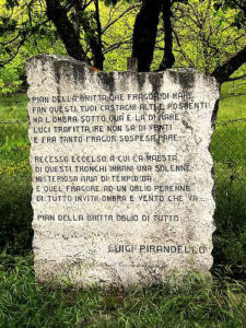 Luigi Pirandello soggiornò con la moglie Antonietta Portulano ed i figli Stefano, Fausto e Lietta per alcune estati negli anni Dieci del Novecento a Soriano nel Cimino dove scrisse due novelle “Suona l’epistola” e “Rondone e rondinella” ed alcune poesie. Nel primo racconto parla di un giovane suddiacono Tommasino Unzio che abbandona il seminario per una vita mistica e contemplativa a stretto contatto con la natura che lo porterà a morire per “un filo d’erba”. Nell’altro Pirandello descrive in dettagli intriganti l’amore clandestino di due amanti che d’estate si ritrovano a Soriano nella villetta presa in affitto dal farmacista del posto. Nelle due novelle il “paesello di montagna” entra a pieni mani nella scena con la piazzetta, la farmacia, le case patinate dalla storia, il castello, il campo di tiro a segno ed altro. Pirandello trasforma anche in poesia taluni pensieri rivolti ad un bosco di castagni (Pian della Britta), ad un ulivo e ad uno stormo di uccelli. Riportiamo la poesia Pian della Britta che è tra l’altro trascritta su una lastra di travertino che si vede lungo la strada che da Soriano nel Cimino scende a Canepina. Riportiamo il primo verso ben noto per la suggestiva metafora delle foglie che fanno il rumore del mare.