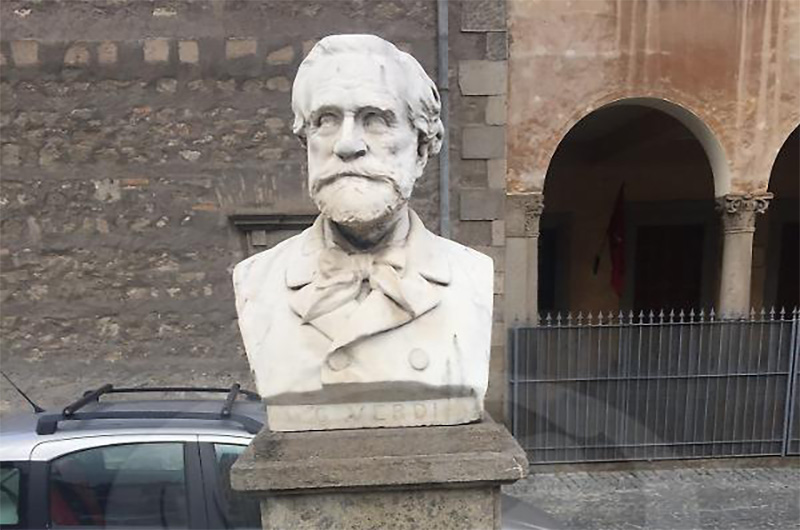A Viterbo, in piazza Verdi, accanto all’edicola, si fa vedere un pregevole busto di Giuseppe Verdi (nella cover) eseguito nel 1904 (circa) da Silvio Sbricoli (1894-1911). Venne restaurato nel 2013 per interessamento del Touring Club dai tecnici del Laboratorio di Restauro della Provincia di Viterbo Linda Bernini, Dino Paparoni e Anna Tozzi sotto il coordinamento dell’allora direttrice Paola Sannucci. Purtroppo il busto continua ad essere esposto agli agenti atmosferici, ai gas di scarico delle auto e agli escrementi dei piccioni che ne compromettono la lucentezza. Sarebbe utile spostarlo in altro sito, ad esempio sotto il portico del vicino palazzo Santoro.