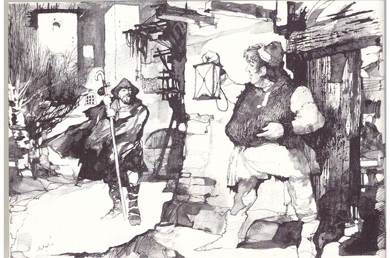 Nella foto, il disegno di Alfonso Artioli (1982) con un pellegrino in arrivo a Viterbo