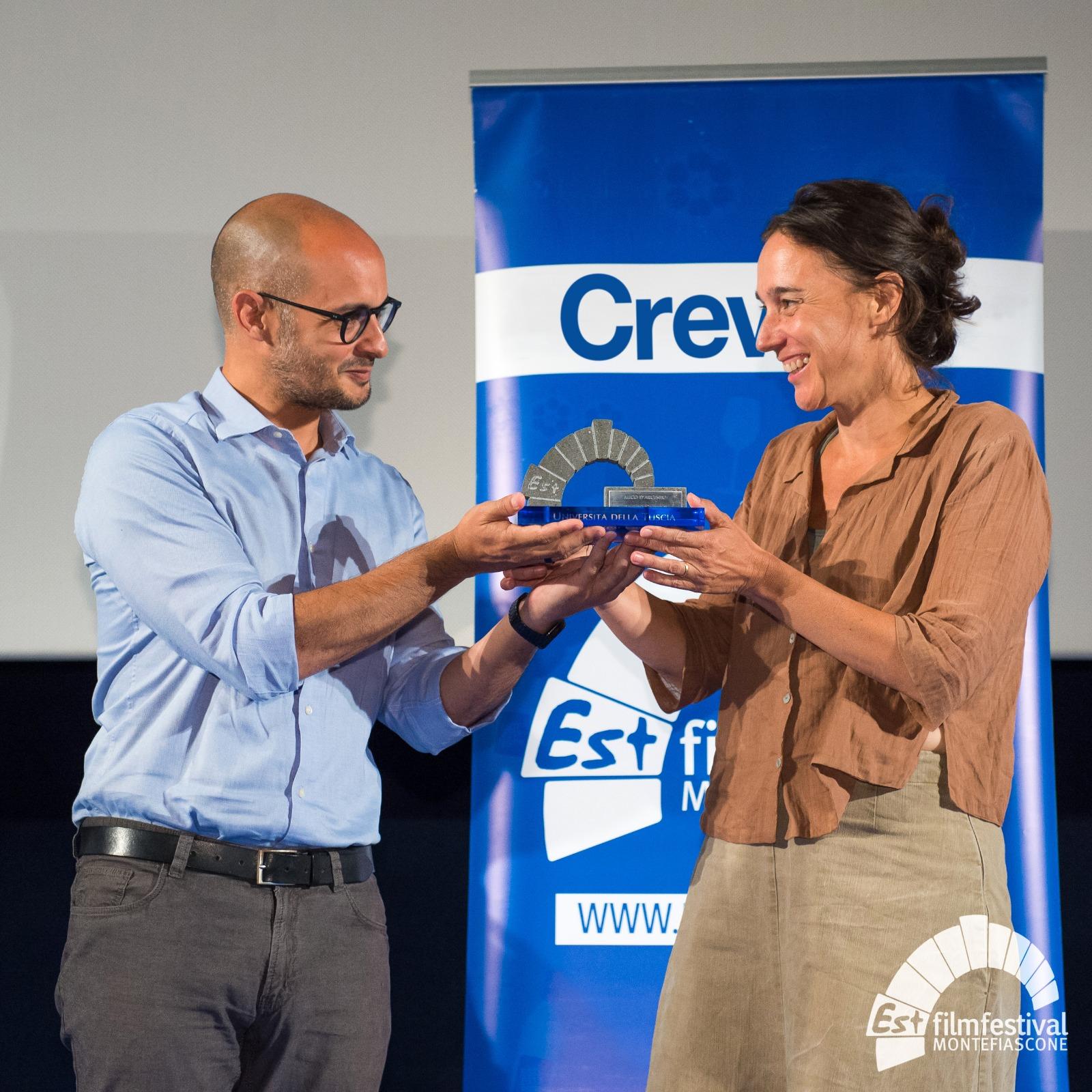 Informazione Digitale presso il Disucom. Il regista Simone Spada, per il secondo anno consecutivo, fa la doppietta portando a casa il Premio alla Miglior Colonna Sonora, l’Arco d’Argento – Premio Terme dei Papi grazie alle musiche di Maurizio Filardo, ricevuto da Giancarlo Necciari di JazzUp Festival direttore della giuria e il Premio del Pubblico – Cantina di Montefiascone ricevuto da Pietro Carletti – Presidente Cantina di Montefiascone. Il suo “Domani è un altro giorno” con 8,94 ha raggiunto il punteggio più alto mai registrato ad Est Film Festival. Il Vincitore dell’Arco d’Oro 2019 – Premio Creval è “Il Bene Mio” di Pippo Mezzapesa che è stato premiato da Marco Della Sala, Direttore Creval Montefiascone. “Nello statuto della nostra banca, datato ai primi del ‘900 e ancora vigente, si legge che obiettivo del nostro istituto è proprio quello di sostenere, promuovere e favorire quelle istituzioni che, con il proprio operato, tendono a migliorare le condizioni sociali, morali e culturali del territorio in cui si trovano” ha dichiarato Della Sala “Diffondere l’arte, in ogni sua forma ed in modo gratuito, che è proprio quello che fa Est Film Festival, è davvero importante. Credo sia un dovere proteggere e sostenere questo Festival che è un piccolo gioiello di cultura del nostro territorio.” ha proseguito il direttore del Creval.