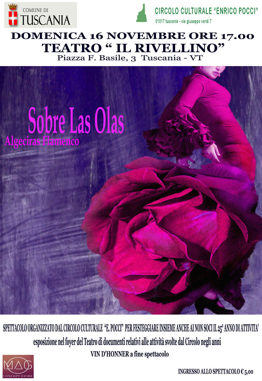 Il Flamenco arriva domenica 16 dicembre a Tuscania alle ore 17 al teatro Rivellino. In scena Sobre Las Olas con la compagnia Algeciras FLAMENCO un’ Associazione Culturale che ha lo scopo di promuovere e diffondere questo danza spagnola. Lo spettacolo è stato organizzato dall’Associazione Enrico Pocci, in occasione dei 25 anni di attivitĂ . Vin d’honneur alla fine dello spettacolo