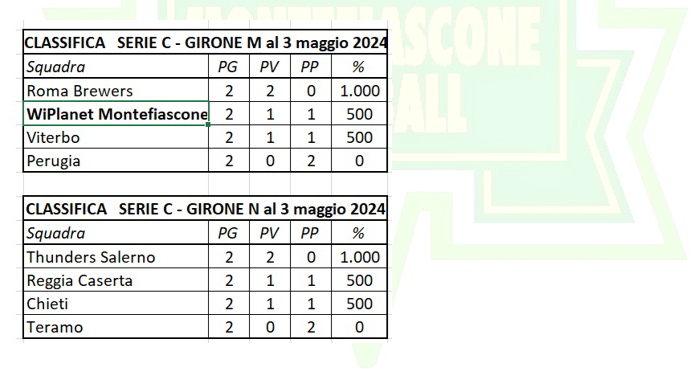 Attualmente le classifiche dei gironi M e N vedono al primo posto con due vittorie rispettivamente i Brewers Roma e il Salerno, seguite da una parte da Viterbo e Montefiascone, dall’altra da Chieti e Caserta. Chiudono con due sconfitte rispettivamente Perugia e Teramo.