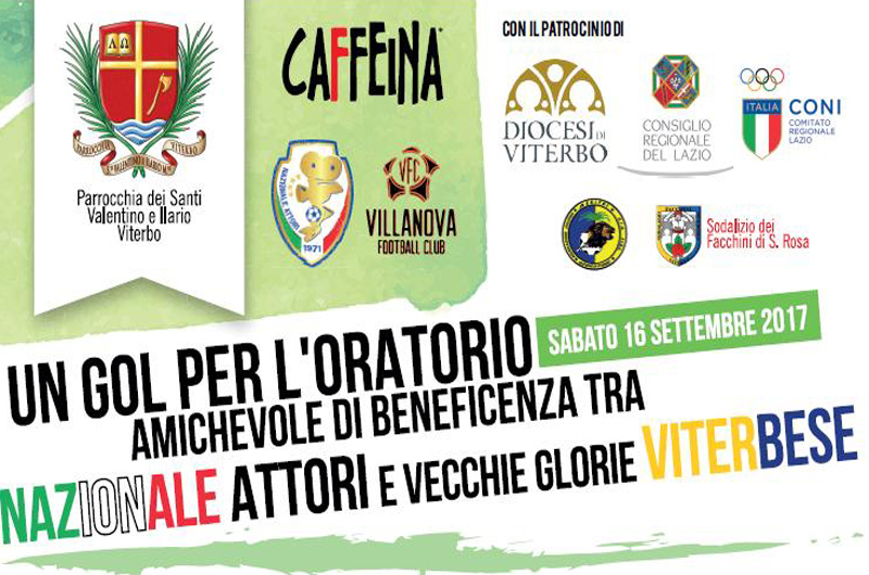 Una grande serata di festa e sport. Il prossimo 16 settembre la Parrocchia Santi Valentino e Ilario della Diocesi di Viterbo, in collaborazione con la Fondazione Caffeina, presenta “Un gol per l’oratorio”, amichevole di beneficenza tra Nazionale attori e vecchie glorie della Viterbese.