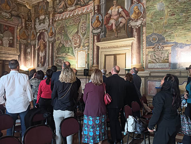 Gli ospiti si sono quindi trasferiti nella sala regia con la guida esperta che ha illustrato la storia di Annio da Viterbo, mitizzata e falsata ma di grande impatto sull’arte di questa stupenda sala di Palazzo dei Priori.