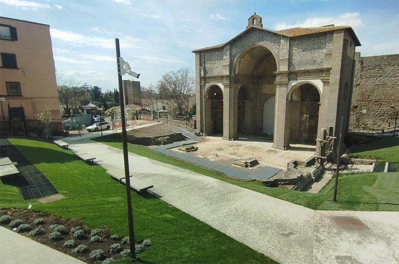 L’identità accennata dei materiali lapidei si interrompe nell’area di nuova bonifica. Lungo i vialetti, infatti, è stato steso quello che sembra, a una visione non ravvicinata essendo il nuovo giardino ancora recintato e non accessibile al momento del sopralluogo, un conglomerato cementizio di pigmentazione più chiara, più fredda e di granulometria evidentemente differente rispetto alla pavimentazione in peperino. (Pronto a una rettifica in caso contrario). Per una coerenza cromatica, considerando che l’area in questione è limitrofa alle mura, sarebbe stata opzione visiva preferibile uniformare i materiali. Un’esigenza di continuità sarebbe stata se non pienamente raggiunta per lo meno contemplata.