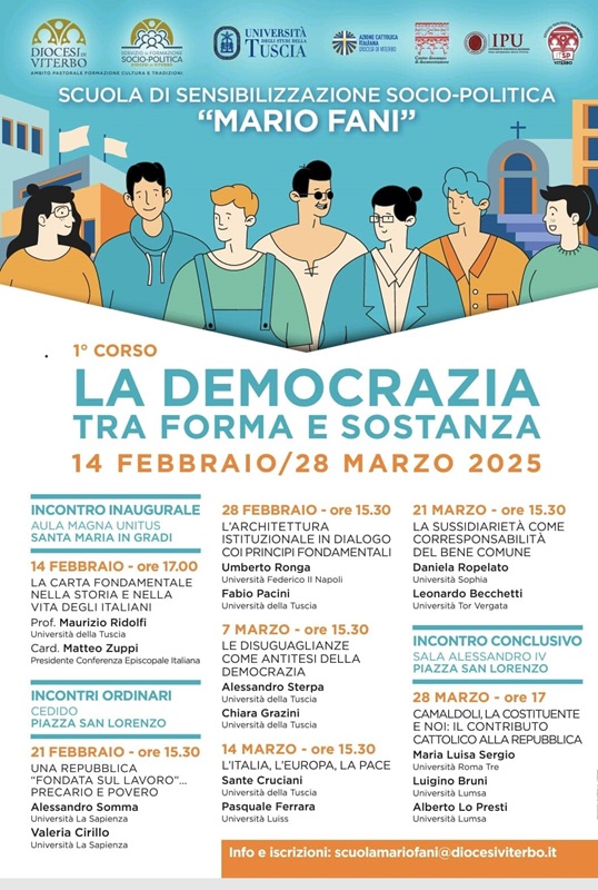 Il primo corso si svolgerà dal 14 febbraio al 28 marzo, con un incontro inaugurale presso l’Aula Magna dell’Unitus (a cui parteciperà anche il Presidente della Cei, cardinale Matteo. Zuppi) mentre gli appuntamenti ordinari, ogni venerdì, si svolgeranno presso il Cedido in piazza San Lorenzo a Viterbo. Partner dell’iniziativa promossa dal Servizio di Formazione Socio-Politica diocesano, oltre all’Università della Tuscia, anche l’Istituto Progetto Uomo di Montefiascone, l’Istituto Teologico San Pietro e l’Azione Cattolica diocesana. Il corso si rivolge principalmente agli studenti dai 17 ai 30 anni, con la possibilità di ottenere Crediti Formativi.