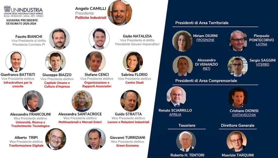 Il Presidente designato Angelo Camilli, terrà la delega Politiche Industriali e sarà affiancato, per il quadriennio 2020 – 2024, dai Vice Presidenti di diritto Fausto Bianchi (Bianchi Assicurazioni Srl) Presidente del Comitato Piccola Industria e da Giulio Natalizia (Natalizia Petroli Spa) Presidente del Gruppo Giovani Imprenditori.