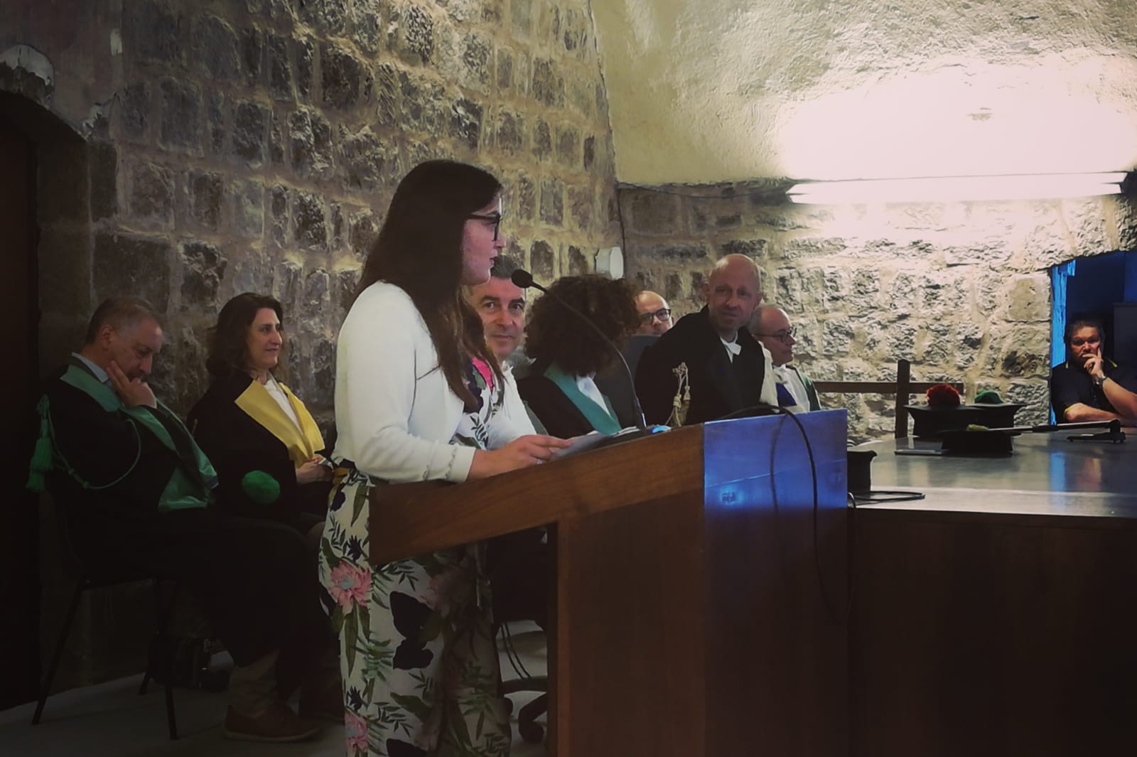Nel cuore medievale della città di Viterbo, l’evento è proseguito con il discorso per il saluto dei neolaureati della dottoressa Silvia Lucarini che ha ribadito l’importanza del diploma di laurea, simbolo di un percorso che ha cambiato la vita, ricordando inoltre i dati statistici di Almalaurea sull’occupazione degli studenti laureati STEM in crescita (discipline scientifiche), per poi invitare tutti a non arrendersi perché c’è posto per tutti e ognuno ha le capacità per fare un buon lavoro: “Dobbiamo essere orgogliosi di noi stessi, di dove siamo arrivati con le nostre forze e di aver realizzato un nostro sogno. Sappiamo tutti che non è semplice trovare un lavoro, in particolare se vogliamo che questo sia inerente al nostro percorso di studi. Ma c’è chi con impegno professionalità e costanza ha preso in mano il proprio futuro partendo da zero. Possedere una laurea significa oggi che abbiamo uno strumento in più per farci conoscere, per mostrare le nostre abilità e sfruttare le conoscenze in ambiti in cui non tutti possono arrivare”.