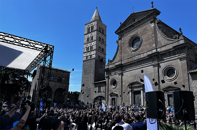 La piazza San Lorenzo nel quartiere medioevale di Viterbo ha ospitato la cerimonia di consegna del diploma di laurea, un momento significativo per l’intera comunità accademica che ha visto la ripresa di questa importante iniziativa interrotta a causa della pandemia. Nelle due sessioni, mattutina e pomeridiana, sono stati consegnati i diplomi a oltre 400 giovani laureati con indosso toga e tocco. I saluti istituzionali si sono aperti con l’intervento del Commissario straordinario del Comune di Viterbo Antonella Scolamiero che, complimentandosi per la scelta della Piazza per la celebrazione della cerimonia, ha rivolto un pensiero ai ragazzi per il traguardo raggiunto, per la grande soddisfazione di tutti i familiari presenti, augurando buon lavoro a tutti i laureati.