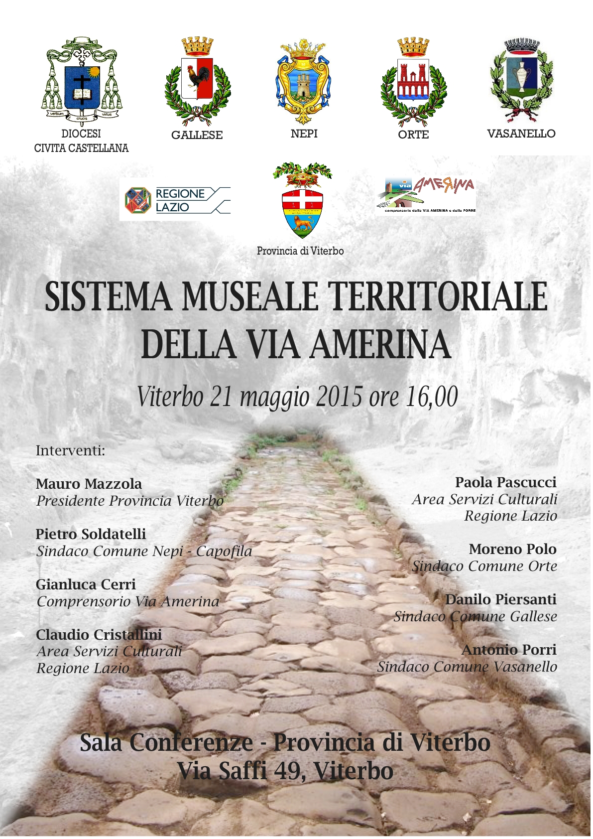 Alla conferenza parteciperanno il presidente della provincia di Viterbo Mauro Mazzola, il dirigente dell’Area Servizi Culturali della Regione Lazio Claudio Cristallini, il funzionario dell’Area Servizi Culturali  della Regione Lazio Paola Pascucci, il coordinatore del Comprensorio della via Amerina e delle Forre Gianluca Cerri e i sindaci di Nepi Pietro Soldatelli, di Gallese Danilo Piersanti, di Orte Moreno Polo, di Vasanello Antonio Porri e i rappresentanti della Diocesi di Civita Castellana.