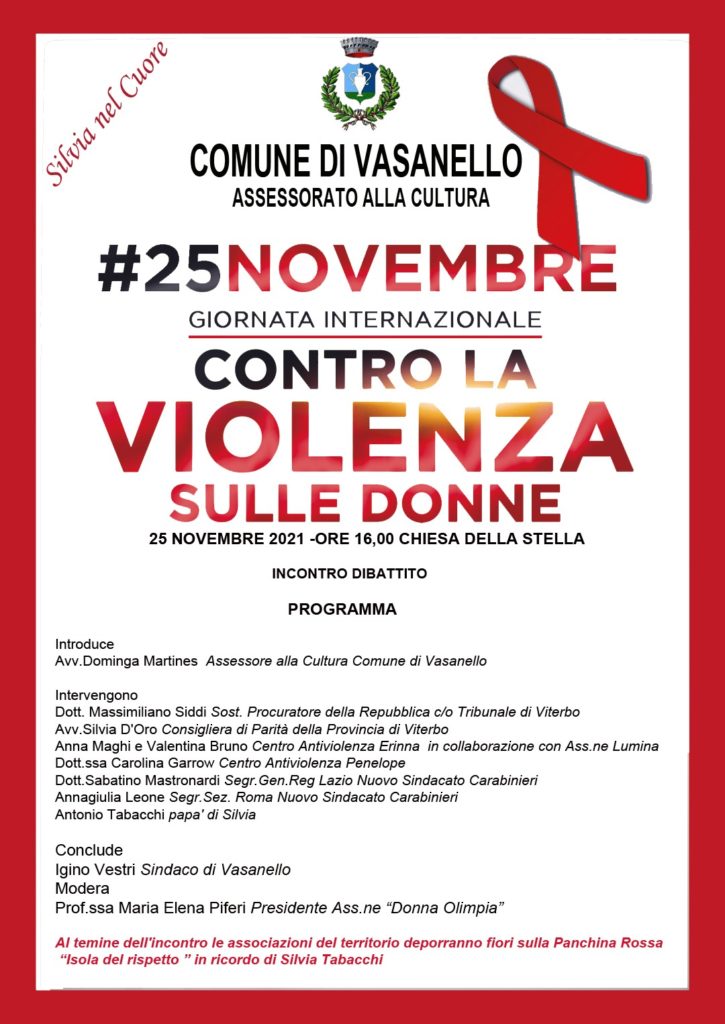 Il programma, che sarà introdotto dall’assessore alla cultura avv. Dominga Martines, vedrà l’intervento di numerosi relatori fra cui il dott Massimiliano Siddi, sostituito procuratore della Procura della Repubblica di Viterbo, della Consigliera di Parità della Provincia di Viterbo, avv Silvia D’Oro, di alcune operatrici dei centri Antiviolenza Penelope ed Erinna nonché di personale dell’Arma appartenenti al Nuovo Sindacato Carabinieri e in particolare di Antonio Tabacchi papà di Silvia, la giovane vasanellese barbaramente uccisa dall’ex fidanzato il 17 marzo 2017.
