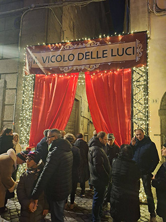 Il Vicolo delle luci annovera un pubblico numeroso, in fila, abbagliato dalla suggestione dagli antichi mestieri e dalla Natività.