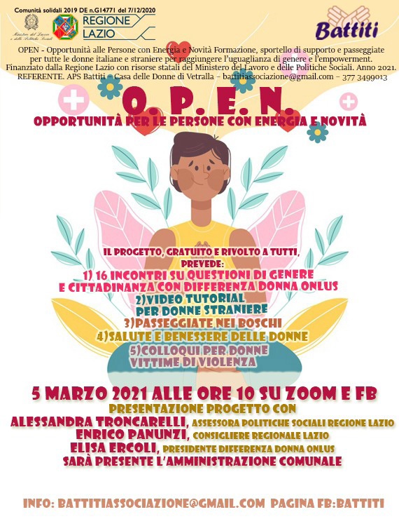 Il 5 marzo, in occasione della FESTA DELLE DONNE, inizia il percorso formativo del progetto “OPEN – Opportunità per le persone con energia e novità”, sulle questioni di genere e sui diritti delle donne, organizzato dall’associazione Battiti con le docenti della famosa associazione Differenza Donna Onlus (associazione che gestisce il 1522, numero nazionale antiviolenza) e con la partecipazione di tanti nomi del mondo associativo, dei movimenti e delle istituzioni.