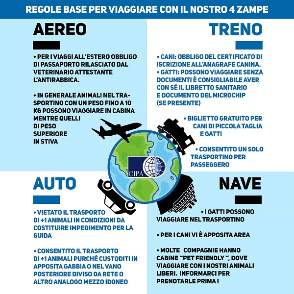 Quanti conoscono le regole per viaggiare con un animale? Ecco allora che l’Organizzazione internazionale protezione animali (Oipa) ha realizzato un’infografica di sintesi per poter viaggiare in loro compagnia senza problemi.