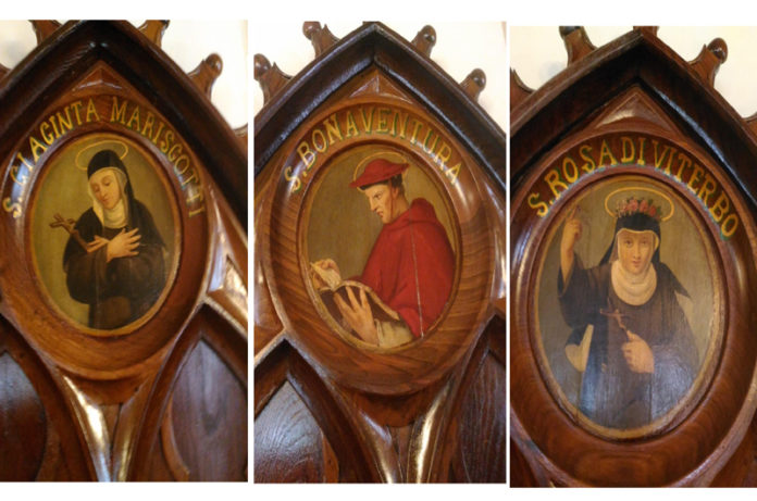 Sorpresa a Gemona nel Friuli. Nel refettorio del monastero delle Suore Francescane Missionarie del Sacro Cuore (80 coperti riferiti alle attuali presenze di religiose) ho visto le immagini di santa Rosa da Viterbo (è scritto di Viterbo), di santa Giacinta Marescotti (è scritto Mariscotti) e di san Bonaventura. che insieme ad altre decorano gli stalli lignei neogotici ricostruiti dopo il terremoto del 1976. In particolare il volto di Rosa è molto simile a quello della giovinetta raffigurato nella tela settecentesca di anonimo custodita nel Museo del Colle del Duomo di Viterbo. Ma c’è di più. Alla costruzione del monastero risalente al 1861, contribuì in misura determinante padre Gregorio Fioravanti da Grotte di Castro (1822-1894) dei Francescani Minori Osservanti. Divenne sacerdote a Viterbo nel 1845 dove trascorse gli anni giovanili presso il convento di Santa Maria del Paradiso. Trasferito a Venezia, divenne nel 1856 generale della Provincia minoritica lombardo-veneta. Per la costruzione del monastero di Gemona che venne gravemente danneggiato insieme al paese dal terremoto (circa 400 morti) – e quindi ricostruito – fu provvidenziale l’incontro nel 1860 con la duchessa Laura Leroux de’ Bauffremont che finanziò l’impresa. La visita al monastero e al refettorio – insieme ad una rappresentanza di studenti ed insegnanti della Scuola Paritaria del Paradiso di Viterbo – guidata da suor Chiarafrancesca del Sacro Cuore, si è resa possibile grazie all’interessamento del parroco di Grotte di Castro don Tancredi Muccioli.
