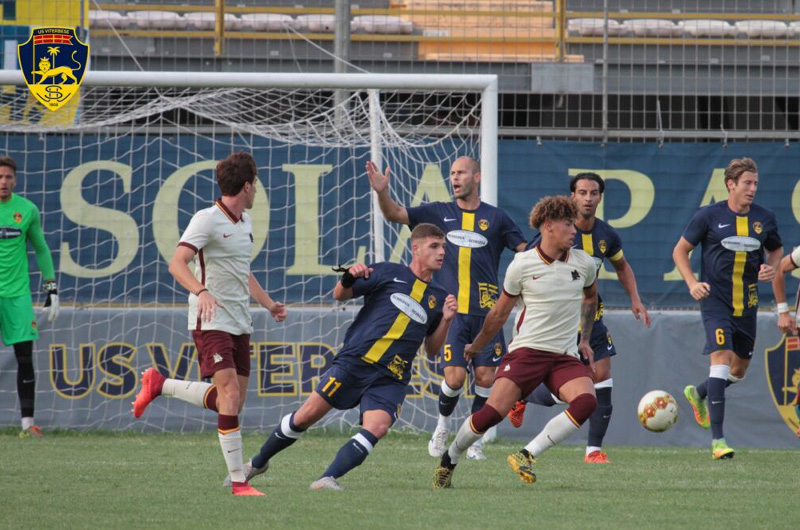 Viterbo – Una buona sgambatura per la Viterbese che scesa in campo con una formazione ancora molto sperimentale supera di misura i primavera della Roma guidata in panchina da una legenda del calcio giovanile come Alberto De Rossi. Maurizi manda in campo il miglior undici disponibile al momento ripresentando Palermo a centrocampo, Tounkara in avanti al quale gli affianca un ottimi Matteo Menghi mentre in difesa si affida all’esperienza di Markic e Baschirotto. Nel complesso nella prima uscita si sono viste più luci che ombre tenendo conto che nei prossimi giorni altri giocatori si uniranno al gruppo come Mbendè, l’ex difensore del Catania presente in tribuna ad assistere all’incontro e che verrà ufficializzato nelle prossime ore e Alessandro Rossi pronto al debutto con la maglia gialloblù. Nella prima parte di gara la Viterbese, reduce da un intenso e duro lavoro a Cascia, ha sofferto il dinamismo e la freschezza dei giovani giallorossi che hanno evidenziato elementi di spicco come l’esterno Providence, la mezzala Zalewski, Ndiaye e Seck. Poi la squadra di Maurizi ha trovato le giuste distanze e geometrie per uscire fuori alla distanza. Vantaggio firmato da Bensaja dal dischetto per un fallo subito dall’ottimo Simonelli, poi il pareggio di Ciervo prima del gol partita firmato dall’irriducibile Baschirotto. Nel complesso buone le prestazioni dei singoli con Simonelli, Bensaja, Baschirotto, Tounkara e Markic già in discreta forma, ma le note liete arrivano dai giovani con Simonelli, De Santis, Sibilia, Bezziccheri e Menghi sopra le righe.