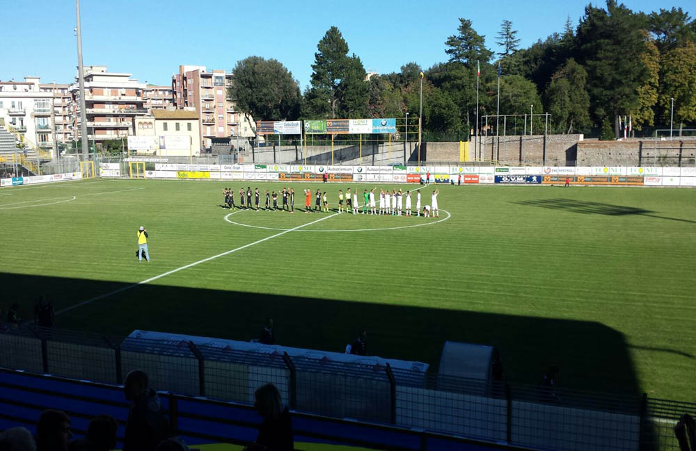 La partita inizia e le due squadre si assestano in campo con una buona organizzazione, dando vita a un gioco piacevole. Al 2° minuto sono gli ospiti a procurarsi la prima occasione per portarsi in vantaggio con Giandonato, che riceve un traversone al limite dell’area, si fa spazio e tira all’esterno del palo. Replica tempestivamente il team gialloblù con Diop, che all’11° minuto vede libero Neglia a ridosso della porta, il giocatore prende bene la mira, ma trova i riflessi pronti di Mazzoni, che si allunga e devia in calcio d’angolo. Al 23° minuto, gli amaranto puniscono con cinismo e furbizia una papera difensiva di Scardala, che temporeggia nel controllo di una palla apparentemente innocua e viene anticipato alle spalle da Mendes, che di destro appoggia la sfera in rete, siglando il gol dello 0 a 1. Al 34° minuto è ancora il Livorno a rendersi pericoloso con un calcio di punizione battuto da Giandonato, che trova la presa sicura di Iannarilli. La Viterbese non riesce a dare concretezza alla propria manovra offensiva, anche perché la retroguardia toscana controlla bene ogni spazio. L’ultimo tiro degno di nota è di Belcastro, che dalla lunga distanza spara dritto tra le braccia del portiere toscano. Il primo tempo si chiude con gli amaranto in vantaggio, grazie a una clamorosa incomprensione tre difesa e portiere gialloblù. Uno dei pochi errori nell’arco di una gara sostanzialmente equilibrata, che ha visto i padroni di casa molto intraprendenti a centrocampo, ma privi di un attacco davvero efficace e gli ospiti bravi a ottimizzare l’unica occasione in avanti e a chiudersi in difesa per proteggere il risultato.