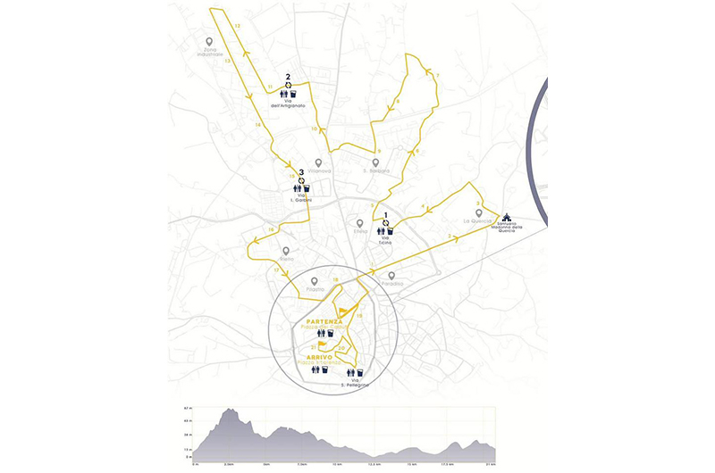 Piazza dei Caduti (partenza), via Marconi, piazza Verdi, via f.lli Rosselli, via della Ferrovia, viale Trieste, via e piazza del Santuario, via Campo Graziano, strada Cupa, strada Ellera, via Ticino, via Dora Riparia, strada Capretta, strada Piscin di Polvere, strada Capretta, strada Santa Barbara, via Porsenna, via Cerveteri, strada Teverina, strada SS Salvatore, via dell’Artigianato, strada Poggino, via dell’Industria, via Garbini, via Tuscia, svincolo (Cassia Nord – Strada Tuscanese), via Falcone e Borsellino, piazza degli Inventori, largo O. Della Porta, via Volta, viale Buozzi, via del Pilastro, piazza della Rocca, via e piazza San Faustino, via Cairoli, piazza dei Caduti, via Marconi, piazza Verdi, corso Italia, piazza delle Erbe, via Saffi, piazza Fontana Grande, via delle Fabbriche, via San Pietro, via San Pellegrino, piazza San Carluccio, via Macel Maggiore, via Cardinal La Fontaine, via Annio, via Cavour, piazza del Plebiscito, via e piazza San Lorenzo (arrivo).