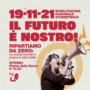 In occasione della data di mobilitazione nazionale del 19 novembre lanciata dalla Rete degli Studenti Medi, a Viterbo è stata organizzata dall’associazione stessa un’assemblea pubblica a piazza della Rocca, alle 10.00. L’evento, a cui sono invitati anche alcuni sindacati e realtà del territorio, oltre ai Dirigenti Scolastici della provincia, ha come obiettivo quello di discutere delle problematiche che gli studenti vivono nel quotidiano non solo con i ragazzi, ma anche con gli altri utenti della scuola.