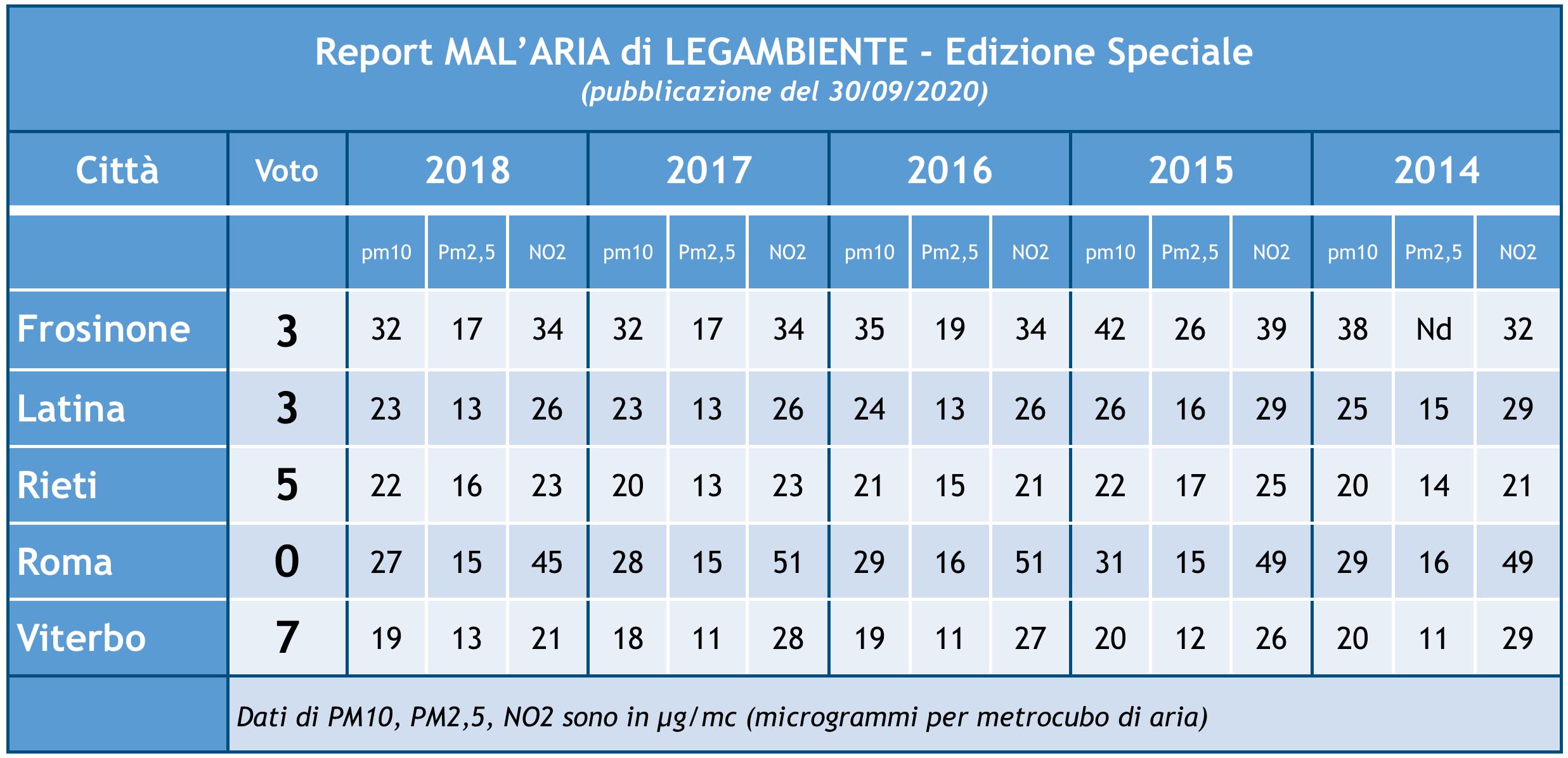 I voti dei capoluoghi del Lazio sono: Viterbo 7, Rieti 5, Frosinone e Latina 3, Roma 0. La capitale è trascinata nel fondo della classifica soprattutto per i dati pessimi relativi alla presenza di NO2 (biossido di azoto) causato in particolare modo dalla presenza di autovetture diesel: Roma supera infatti i limiti di legge europei e quelli dell’OMS in tutti i 5 anni presi in considerazione, con picchi di 51 µg/mc.