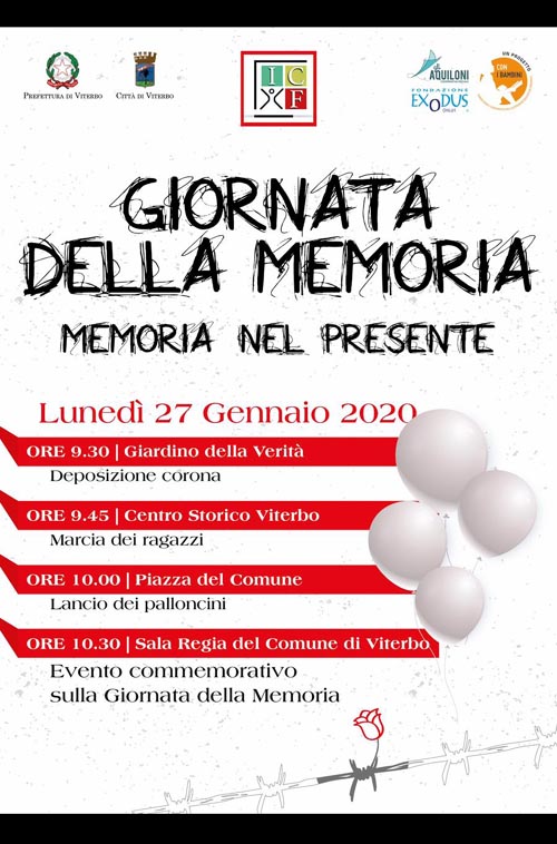 A Viterbo lunedì 27 gennaio le celebrazioni inizieranno alle 9,30: il sindaco Giovanni Maria Arena deporrà una corona in via della Verità nei pressi dell’abitazione di Emanuele Vittorio Anticoli, Bruno Di Porto e Letizia Anticoli, la famiglia ebrea che trovò la morte nei campi di concentramento ad Auschwitz e Mauthausen nel 1944. Alla loro memoria sono visibili tre pietre d’inciampo, in via della Verità nello stabile da cui furono presi, oltre ad una targa.
