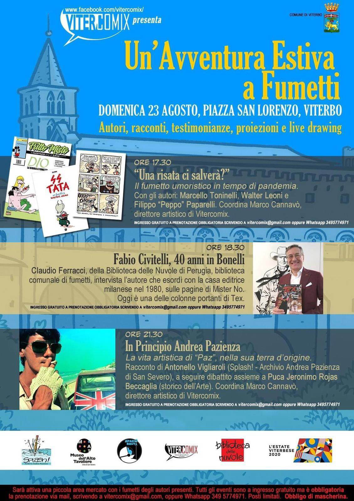 ViterComix, un’avventura estiva a fumetti. Appuntamento per domenica 23 agosto a piazza San Lorenzo, a partire dalle ore 17.30, tra autori, racconti, testimonianze, proiezioni e live drawing. Tre gli incontri in programma. Si comincia (alle 17.30) con “Una risata ci salverà?”. Il fumetto umoristico in tempo di pandemia. Interverranno gli autori Marcello Toninelli, Walter Leoni e Filippo “Peppo” Paparelli. Coordina Marco Cannavò, direttore artistico di Vitercomix. Seguirà, alle 18,30, Fabio Civitelli, 40 anni in Bonelli. Claudio Ferracci, della Biblioteca delle Nuvole di Perugia, intervista l’autore che esordì con la casa editrice milanese nel 1980, sulle pagine di Mister No. Oggi è una delle colonne portanti di Tex. Alle ore 21.30 sarà la volta dell’incontro In Principio Andrea Pazienza. La vita artistica di “Paz”, nella sua terra d’origine. Racconto di Antonello Vigliaroli (archivio Andrea Pazienza di San Severo), a seguire dibattito insieme allo storico dell’arte Puca Jeronimo Rojas Beccaglia. Coordina Marco Cannavò, direttore artistico di Vitercomix.