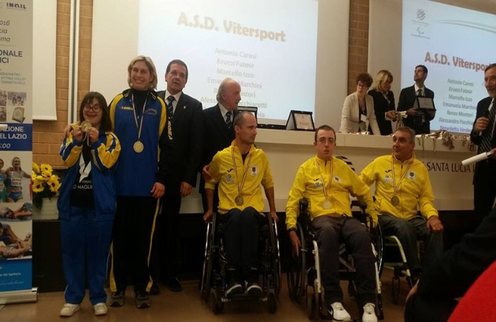 Molto soddisfacente il risultato ottenuto dalla A.S.D. Vitersport Libertas che ha partecipato alla manifestazione con sette atleti, accompagnati dal delegato provinciale C.I.P. Viterbo Carlo Aronne, da Edvige Amelia Marotta, delegato regionale F.I.W.H. e dal Presidente dell’associazione Paola Grispigni: Alessandro Pacchiarotti è stato premiato come campione nazionale finp nella categoria S3, ai campionati assoluti nazionali invernali di Reggio Emilia per la medaglia d’oro conquistata nei 50 metri dorso; Benedetta Verdecchia, Emanuela Marchini, Antonio Carosi per le medaglie conquistate ai campionati regionali di categoria fisdir; Marcello izzo e Renzo Montori per la medaglia d’oro conquistata nella coppa Italia calcio balilla; Fatmir Kruezi campione regionale Lazio handbike categoria mh4.