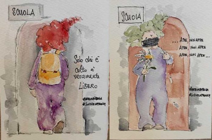 “Ritorno in presenza” voglia d’incontro con i compagni con gioia ed eccitazione,per la Francy, la figura creata da Francesca Maurizi di Arte in Bottega, il laboratorio che agli scolari dedica articoli e spazi. Dice la Francy ” Solo chi è colto è veramente libero”. Certo sarà dura tornare alla vita scolastica dopo tanto isolamento. “La maestra ha assicurato che ci ritroveremo in un clima positivo, di resilienza e di speranza che abbracci l’intera scuola” Tutti pronti a ricominciare ma per favore non parlate solo di cose negative .Tutto si supera con gli spazi giusti la mascherina, il lavarsi le mani, dispenser di gel disinfettanti e distanze…Parola di Francy!