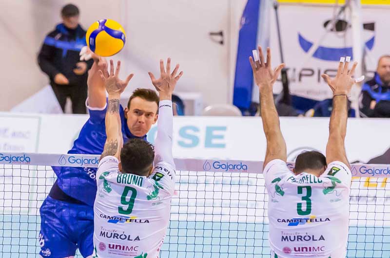 Secondo set: servizio fuori di Calonico, Di Pinto chiede il video-check che gli dà ragione. Attacco fuori di Porcello, ancora video-check chiesto da Macerata che si vede assegnare il punto 4/5. Rizo chiude uno scambio prolungato e Macerata allunga 5/8. Tofoli chiede il primo time-out. Al rientro, attacco vincente ed ace di Polluaar 7/8. L’opposto estone sembra incontenibile e riporta i suoi in parità 10/10. Attacco vincete di Rossatti, Di Pinto ricorre al time-out 11/10. Al rientro Nasari mette a terra l’11 pari. Muro vincente di Monopoli su Rossatti 11/13. Un muro di Polluaar su Bruno chiude un lungo scambio 15/16. Calonico mette fuori un primo tempo, 16 pari. Ace di Nasari 16/18. Bruno trova il mani fuori 16/19, time out chiesto da Tofoli. Al rientro attacco vincente di Rizo 16/20. Due ace di Rizo regalano il primo set point a Macerata, 19/24. Attacco vincente di Bruno e i marchigiani portano a casa anche il secondo parziale 20/25.
