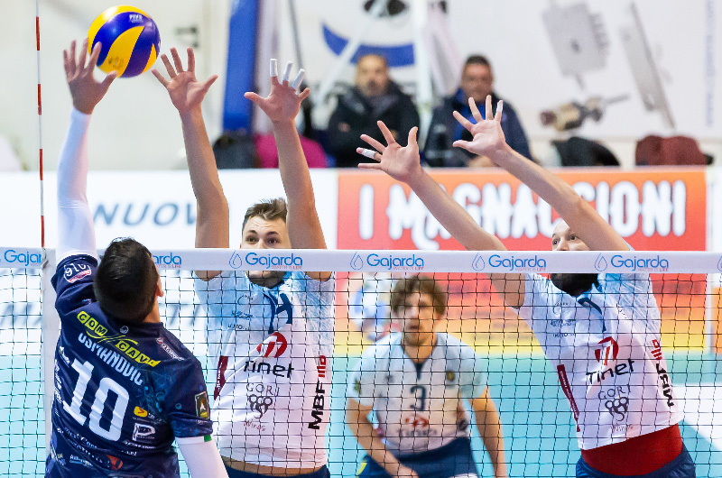 Terzo set – Il parziale inzia all’insegna dell’equilibrio. Attacco vincente di Panciocco e ace di Formela, Sturam ricorre alle riprese, che però danno ragione agli arbitri 6/4. Muro vincente di Panciocco, Tuscania prova a scappare 7/4. Sturam chiama il time-out. Gli ospiti reclamano un doppio tocco, il primo arbitro estrae il cartellino giallo. Due attacchi vincenti di Link e Prata accorcia 9/7. Nel Tuscania fuori Soli per Ugo Buzzelli 10/7. Osmanovic mette a terra il 12/8, Sturam chiama il suo secondo time-out. Al rientro Marinelli trova il mani fuori del muro 12/9. Osmanovic vincente, ancora massimo vantaggio Tuscania 16/11. Cambio nel Prata, fuori Calderan per Della Corte. Muro vincente su Formela, Nacci ricorre al primo time-out 21/19. Al rientro lo stesso Formela trova un mani fuori 22/19. Marinelli mette fuori il 23/19. Attacco vincente di Panciocco ed è primo set point Tuscania 24/19. Doppio tocco di Calderan e Tuscania si aggiudica il terzo parziale 25/19.