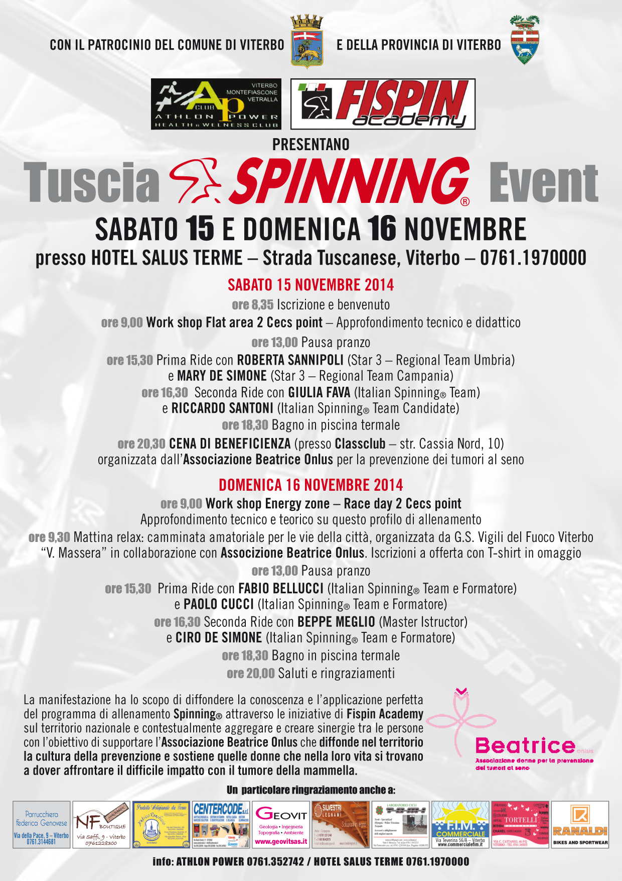 Il 15 e il 16 novembre presso l’Hotel Salus, si potranno  conoscere tutti i segreti di questa disciplina un vero work shop, alla presenza di team e formatori di rilievo nazionale.La manifestazione ha lo scopo di far conoscere l’applicazione corretta del programma di allenamento Spinning attraverso le iniziative promosse dalla Fispin Accademy.Per beneficiare di tutti gli effetti dello spinning si consiglia di praticarlo in una palestra in lezioni di gruppo e con istruttori qualificati.Il programma della manifestazione include anche la cena di beneficienza il cui ricavato sarà devoluto all’associazione viterbese Beatrice Onlus che si occupa della prevenzione dei tumori al seno.